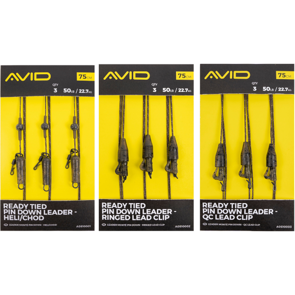 Ready tied versions of Avids best selling Pin Down leader material available in three different variations. Put together with Avids high quality range of Outline camo end tackle rig bits. Each leader is spliced for maximum strength and safety. Choose from Heli/Chod, Ringed Lead Clip & QC Leadclip options. Â