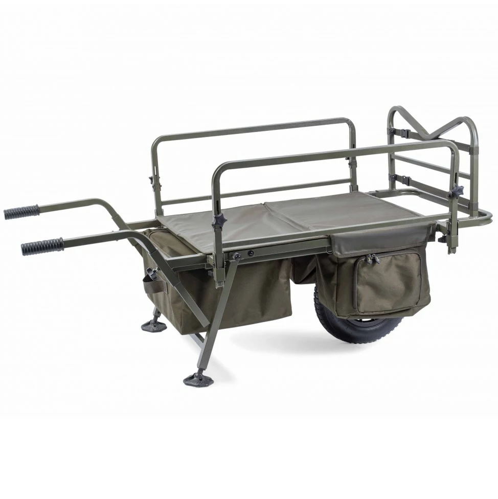 - Packed with innovative features, transporting heavy tackle over long distances is made easy. A whole host of possible configurations allow gear to be loaded or unloaded quickly and easily, with the extending front rack ideal for larger items such as bedchairs. The two heavy-duty straps keep everything locked down, with easy access space in the side pockets for storage.
