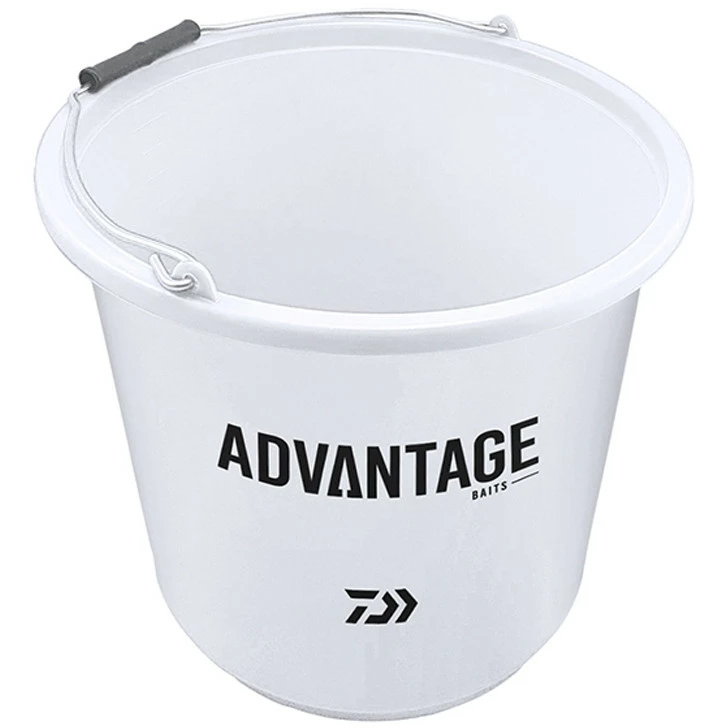 Daiwa Advantage bait buckets, available in 12 and 18 litre size options. The larger 18 litre comes with a lid and is designed so the smaller 12 litre size can stack neatly inside. Both buckets have a strong metal carrying handle with a fitted grip.Â