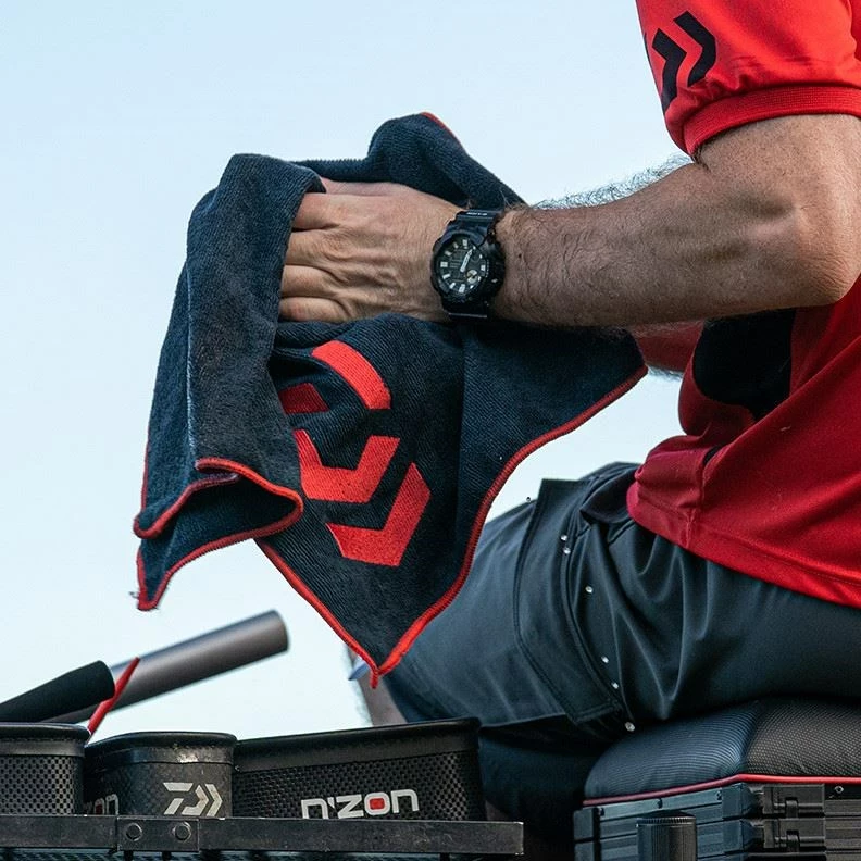 A Daiwa quality microfiber hand towel ideal for wiping groundbait and fish slime from your hands when fishing.