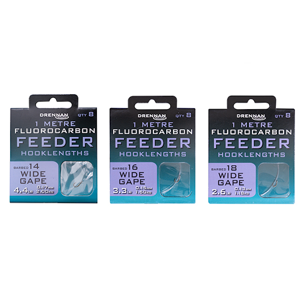 A pack of 8 fluorocarbon hooklengths that come in longer one meter lengths ideal for feeder fishing natural venues where a longer tail often draws bites where shorter lengths would remain untouched. Throw in the near invisibility properties when submerged in water, plus its straighter and stiffer nature and this makes a great alternative to traditional mono. These are tied to a Drennan wide gape hook pattern that makes a great all round choice for fishing baits like worm, sweetcorn and maggots. Â Â