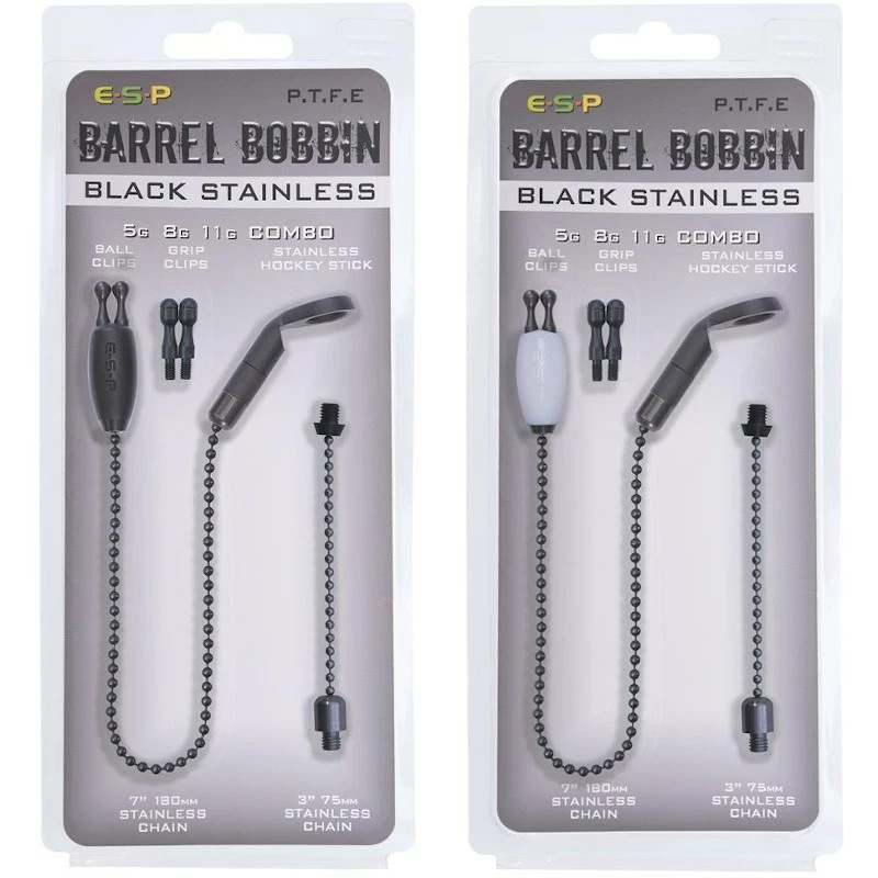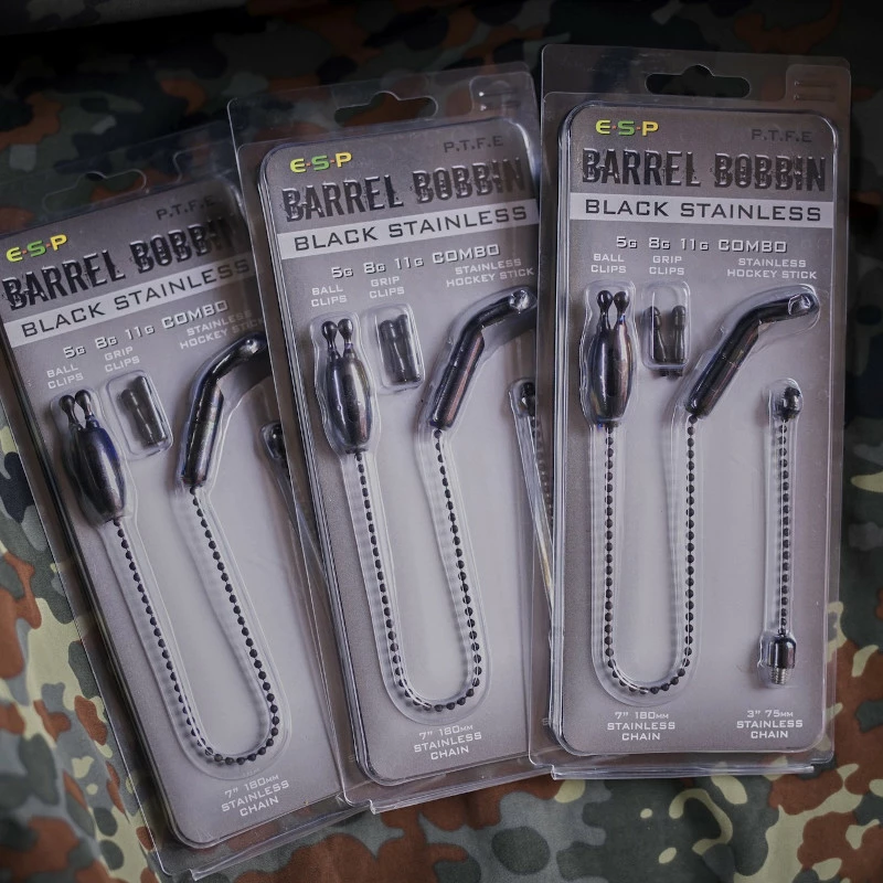 New additions to ESP’s popular barrel bobbin range that come with an all black stainless steel hockey stick and chain. Precision engineered and manufactured here in the UK by ESP. Both kit options come supplied with a PTFE bobbin, interchangeable ball clips and grip clips a 3 Inch and 7Inch ball chain plus a 3g add on weight. Everything you need to cover a variety of situations with your bobbin being adjustable to fish at 5g, 8g or 11g so you can vary the resistance according to the conditions on the day.  Â
