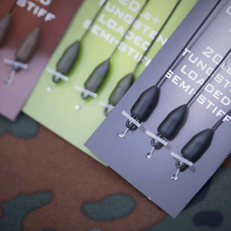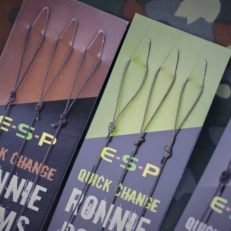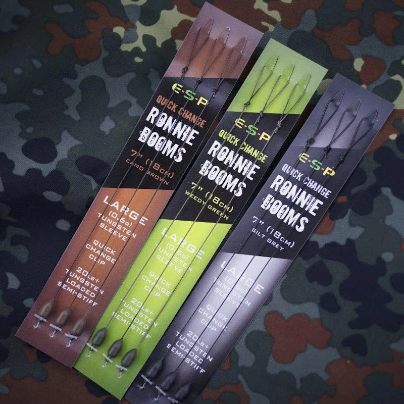 Perfect boom sections with a quick change swivel clip to allow fast changing of Ronnie and Hinge Rig sections. Hand-tied, in house at Drennan’s UK factory facility. They have a figure of eight loop to attach to your mainline and an all-important tungsten sleeve that acts as a counterbalance to your popup, and secures your hooklink in place. Available in 0.3g and 0.6g size options to cope with different bait sizes and in weedy green, camo brown and silt grey colours. Ideal for pairing with ESP’s Trig hammer Ronnie rig sections.