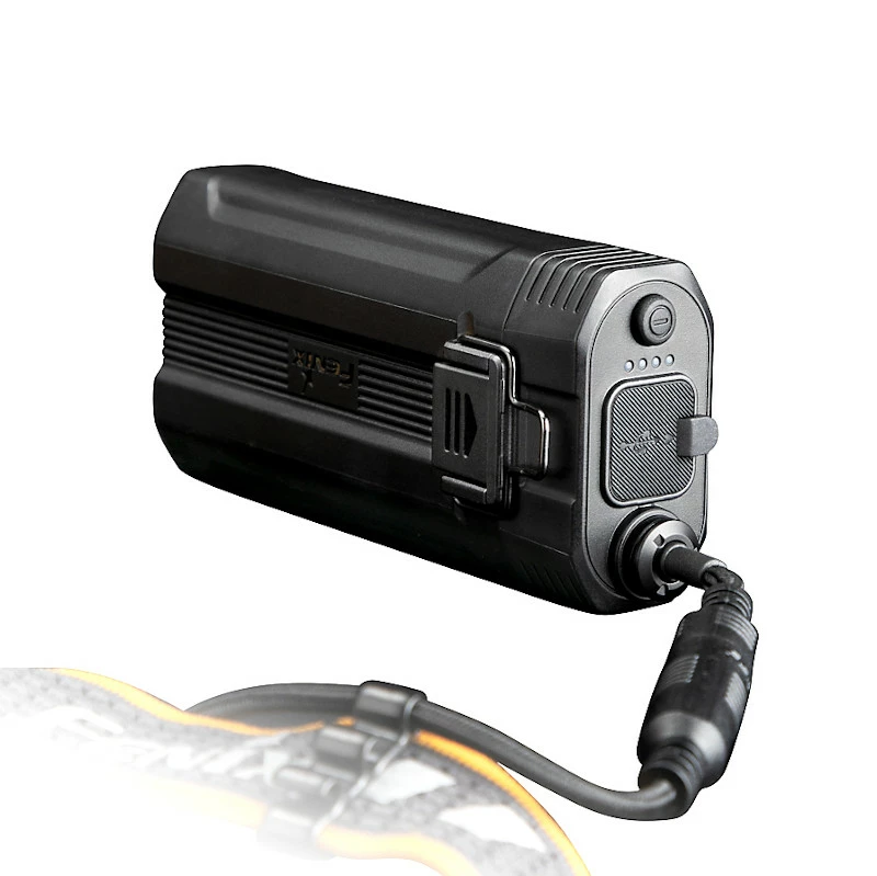 A high performance rechargeable headlamp carrying an IPX6 rating. Â Built for heavy duty industry and rescue work, where you need a super tough reliable lamp that wont let you down. Coming with a large battery capacity powered by two 5000mAh Fenix 21700 batteries. With a simple to use push button and rotary switch system to control the three lighting options, and four adjustable brightness levels. There are fixing options supplied so you can attach the external battery to a helmet, or use the included belt clip. The battery case also has a handy LED power indicator so you can see at a glance if your running low. Â Â