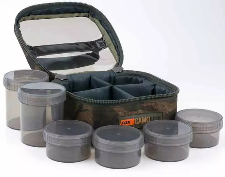 - Supplied with either six or eight pots depending on your choice. This allows you to soak your hook baits in your favourite attractants whilst storing them in neatly sized pots for quick and easy access. Designed using their unique camouflage pattern to fit with the rest of their luggage.