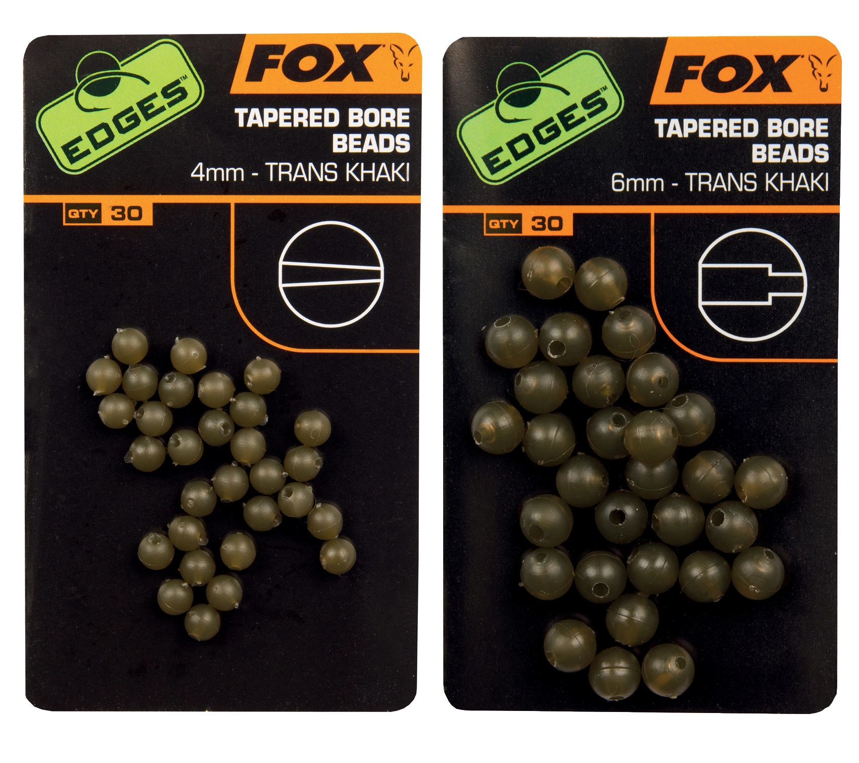 Fox Edges tapered bore beads, available 4mm and 6mm sizes. The smaller 4mm designed specifically for use directly onto leadcore and Submerge leaders, ideal for positioning chods and helicopter style set ups. The 6mm has a stepped taper to sit neatly over swivels and can be used with various presentations.