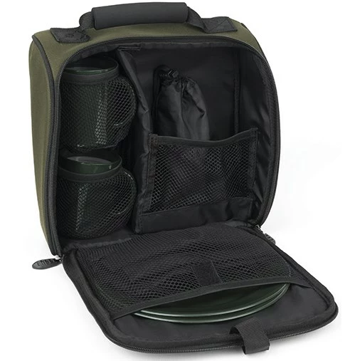 - Keep your cookware organised with this stylish bag containing 2 x stainless steel knives, forks, spoons and teaspoons, 2 x round green plates, 2 x green mugs, 1 x Corkscrew, 1 x large screw top tubs, 2 x small screw top tubs and 1 x Micro fleece towel. It’s all you’ll ever need to keep yourself fed and watered on the bank.