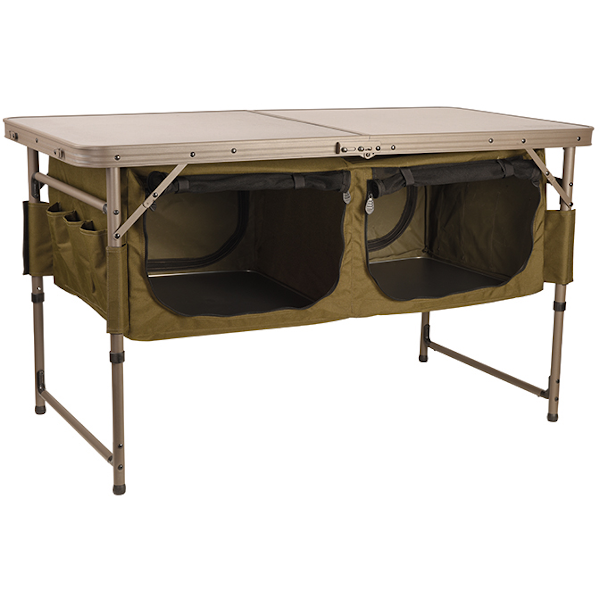 Give yourself that extra space and room to cook and prepare your meals on the bank with this large folding table with additional storage from Fox. Perfect for longer stays, and when you’re expecting friends, great for outside catering, or placing inside your social shelter. Beneath the table itself there are two separate storage spaces with a dividing shelf in each. Both feature zip up mozzie mesh doors that can be tied up and left open if you wish. On the opposite ends there’s a series of pouches for you to sit utensils and cooking tools so you can keep them close to hand. When you’re ready to go home, these fold up completely flat for transport and come in their own zip up storage bag.