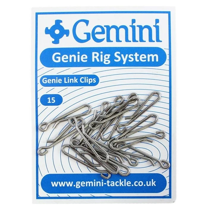 Gemini Genie Link Clips are a quick and easy link clip for attaching your rigs to shock leaders and sinkers. Made from stainless steel 1.2mm dia. wire with a length of 24mm. Its a super strong way to enable you to switch between rigs and leads helping you get back in the water faster.