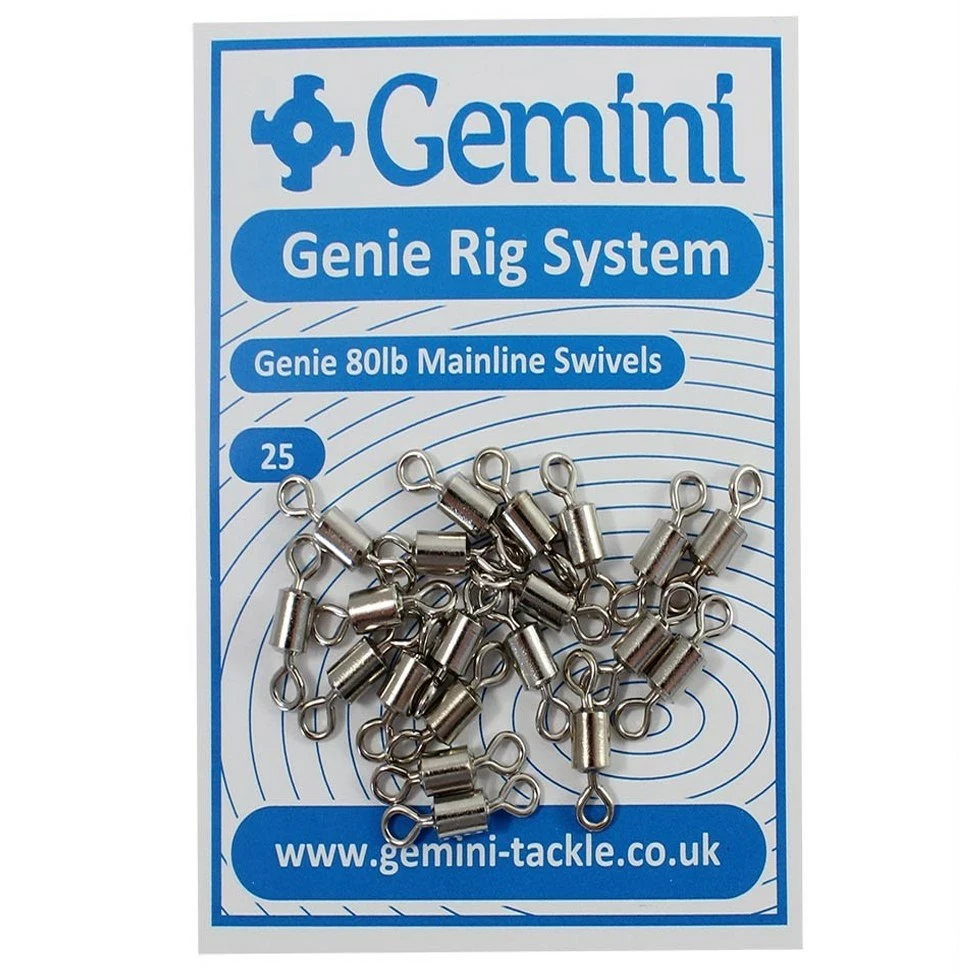 Gemini genie swivels are high quality stainless rolling swivels available in two popular sizes for mainlines and snoods. With 25 swivels per packet.