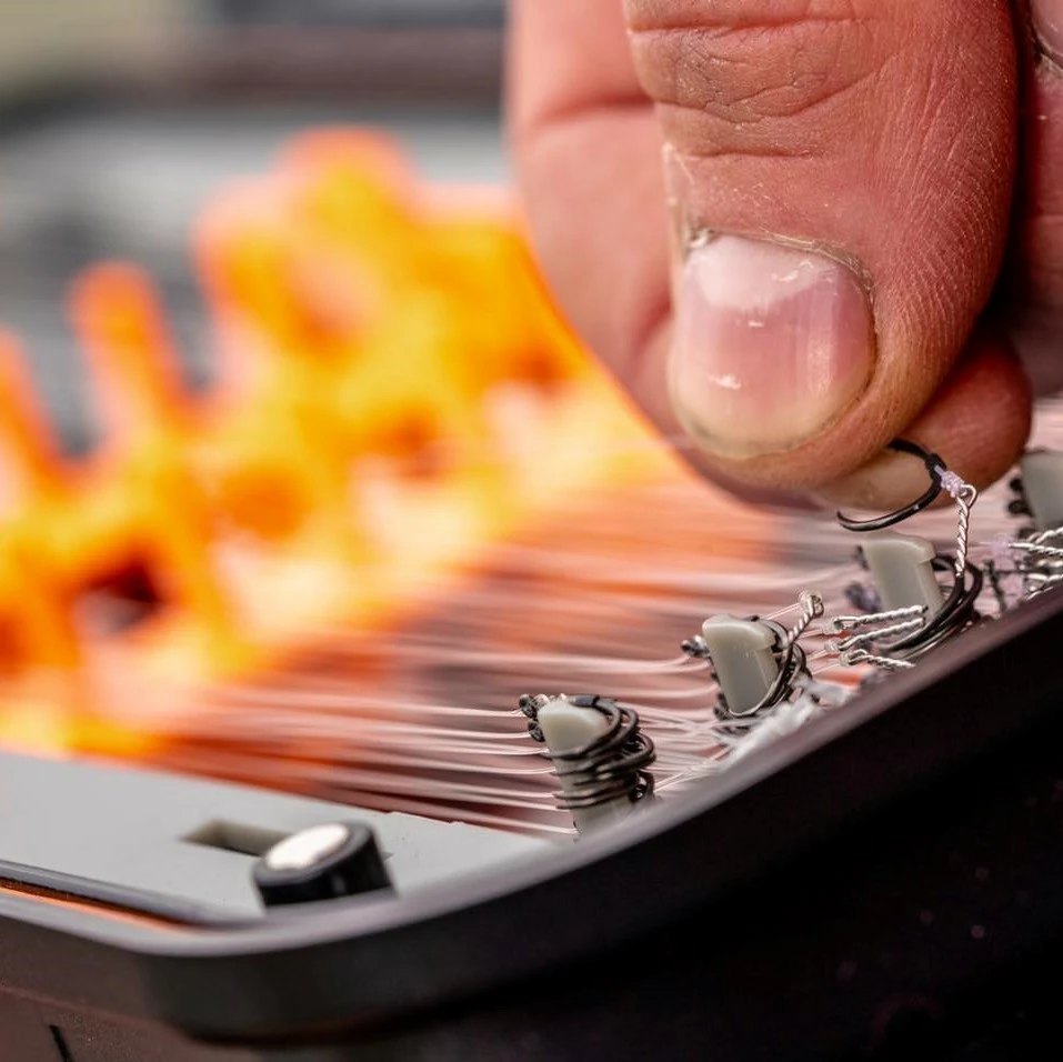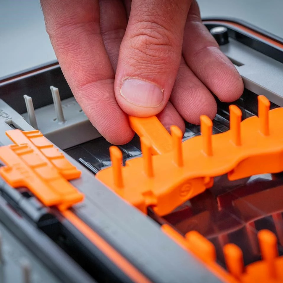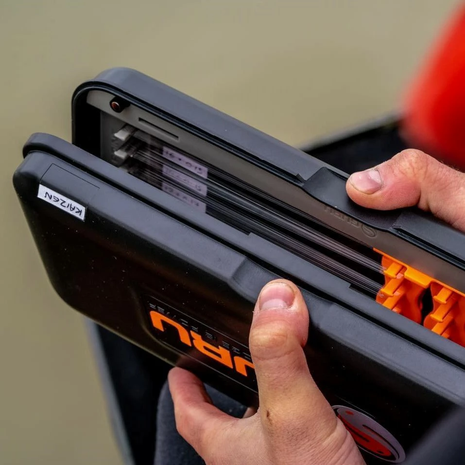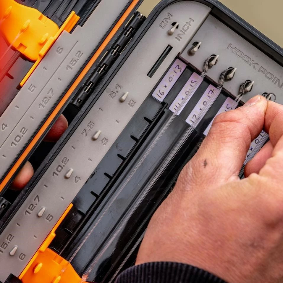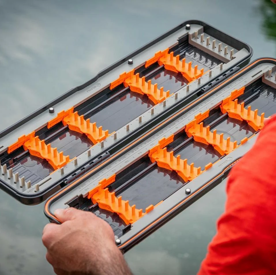 An ingenious adjustable hooklength storage solution from Guru with a clever sliding plate system inside. This allows you to store rigs from two to 6 Inches, or two to 8 Inches depending on which size option you choose. The sliding plates with the locating pins can be moved and locked at half Inch intervals and will happily accommodate hook sizes down to a tiny fine wire size 24. They also have a tiny barb that prevents your hooklengths accidentally slipping off. The outer casing is waterproof and sealed and features easy open gips and a magnetic closure. There’s even a set of labels so you can keep track of what’s what inside.