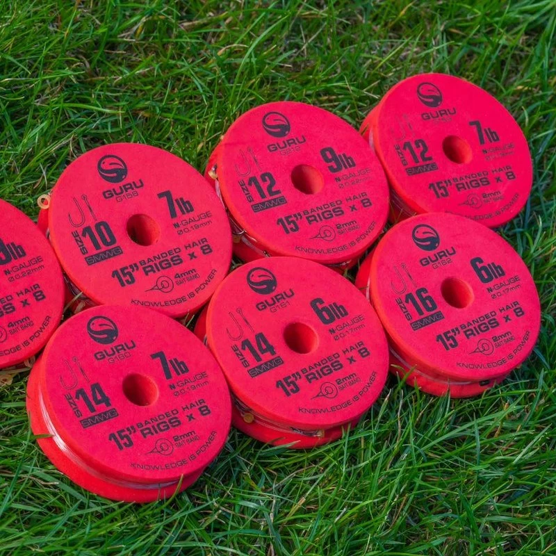Guru Super MWG Bait Band Ready Rigs 15 Inch. High quality pre-tied rigs featuring the Guru wide gape super MWG hook pattern tied to their top quality N-gauge mono. A perfect size for waggler and bomb tactics. These latest versions now come with a small piece of micro silicon on the shank to provide perfect hair alignment and presentation.Â