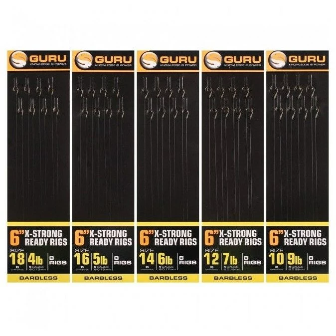 Guru X-Strong Ready Rigs, ideal for targeting big carp with heavy elastics tied using the spade-end extra strength carp barbless hooks. All three patterns feature perfectly tied spade end hooks, as neat as anyone can tie them up themselves, and with a figure-of-eight loop knot at the other end for easy attachment to your line. They all come neatly packaged on cards that make them easy to use – no knots as you try to unravel them! – Plus they will even fit into their cases.