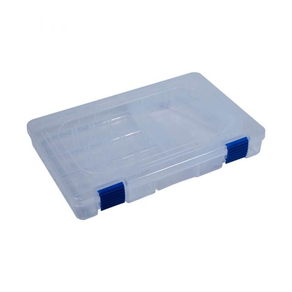 A dedicated home for your jigs and soft plastic lures and rig bits. These clear plastic boxes open with a large divider in the centre, one side is divided into four compartments, the other left whole. So you can keep a selection of jigs and plastics, plus your packets, spares and tools separated and organised. Secures with a pair of sturdy plastic clips.