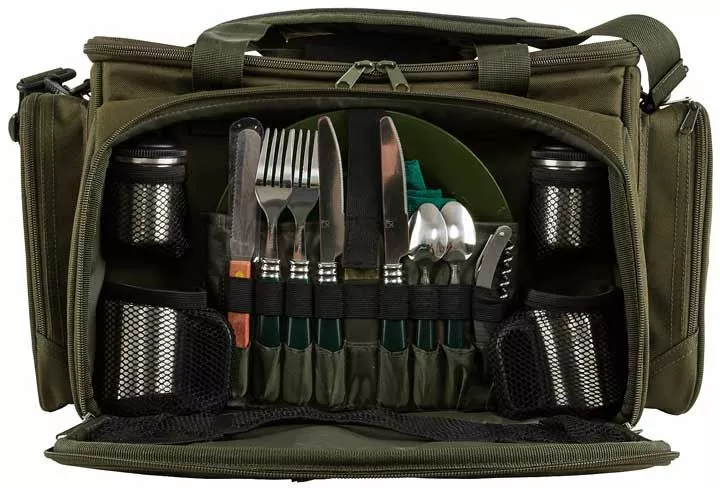 - Perfect for one or two angler’s looking to stay well supplied whilst on the bank. This hamper style carrier has a wipe clean insulated main compartment for easy cleaning, a selection of cutlery and plates etc. and two roomy side pockets which will accept the matching medium and small Accessory bags in the range.