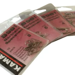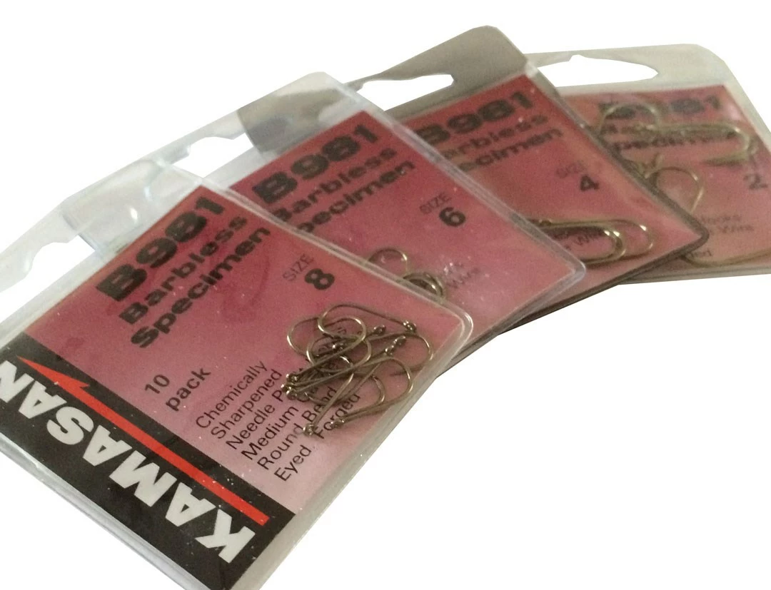 The Kamasan B981 Specimen Barbless pattern is the barbless version of the extremely popular and reliable B980. Produced in a medium gauge high carbon wire it is an ideal eyed barbless hook for all big fish.