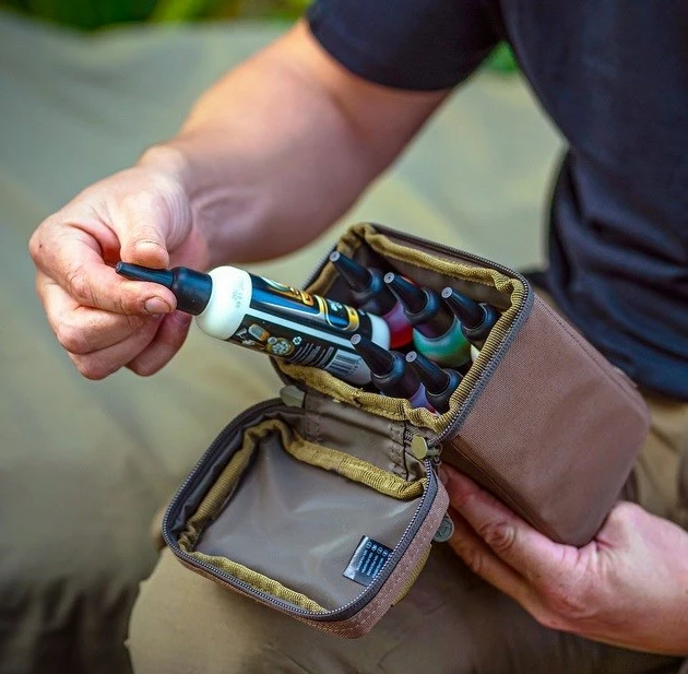 Dedicated transport and storage solution for carrying a selection of Korda’s popular Goo bait enhancers. If you’ve ever accidentally dropped, or broken a bottle of this powerful liquid in your luggage the resulting mess can quickly result in a stinky sticky nightmare! Available in two size options, a small with a capacity for 6 bottles, and a large with room for up to 12 bottles. They both have a wipe-clean inner lining with a removable insert, so if there is a spillage, it’s simple and easy to clean. Manufactured with protective padded walls and with durable water-resistant outer fabric. Fitted with a reinforced carry handle and heavy-duty zips and pullers.