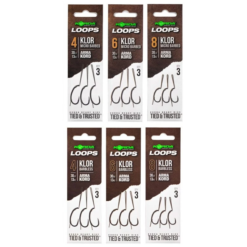 Ready tied loop sections complete with a Korda Klor hook. Designed to give you a simple quick change way of adding your hook section loop to loop style onto a Korda boom section to create the perfect combi rig. The loop section is set up blow-back style but uses a lasso knot instead of the usual rig ring. With no need for additional shrink tube, the in-turned eye of the Klor helps ensure that the hook flips over and takes a hold.