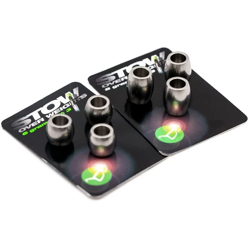 Korda consultant Damian Clarke designed these super-slick additional weights for a more stable presentation when fishing at long range. Because the length of the Stow bobbin has to remain the same to ensure properly they drop away on the take. Damian had to find a way to add weight without adding length, these Overweights are the answer. They slide over the existing weight supplied with the Stow head indicator. An internal shoulder then stops and holds them in position, preventing them from sliding up and down the head.