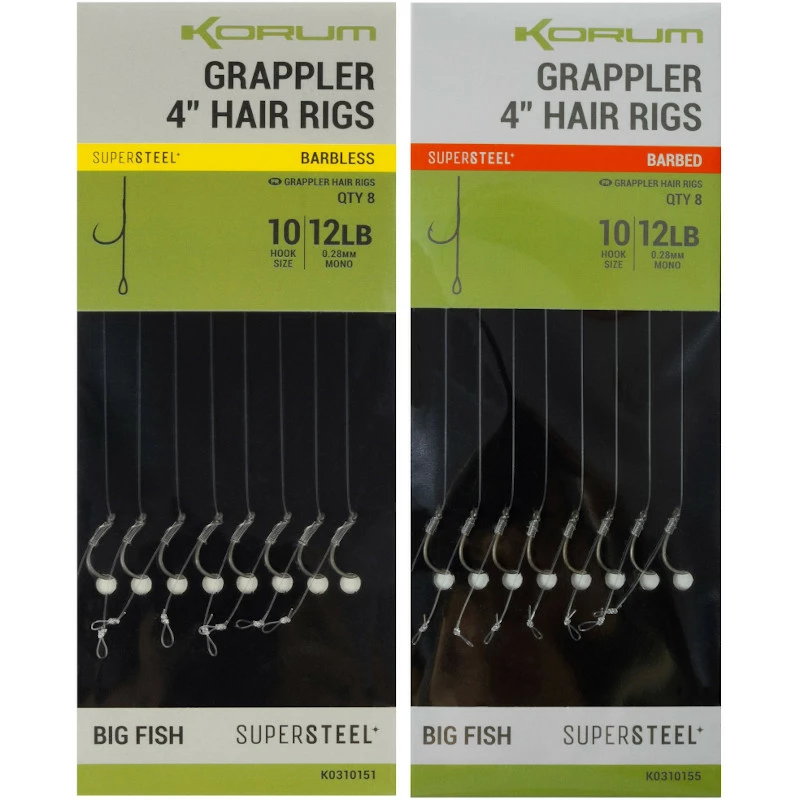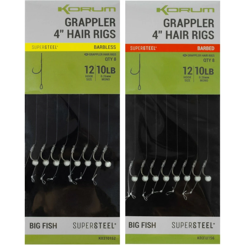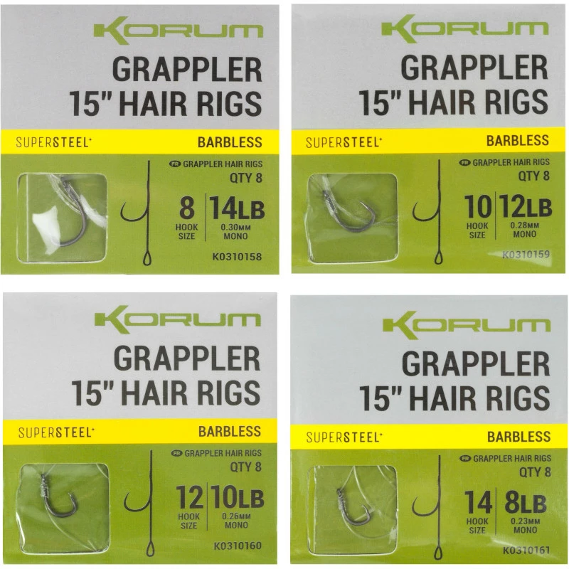 Korum Grappler Hair Rigs are ready tied versions of Korum’s super strong grappler hook pattern. Available in 4 and 15 inch lengths and in both barbed and barbless options. They come tied to abrasion resistant Korum mono in matching breaking strains and have a super strong loop for attaching to your mainline and also on the end of the hair itself. Ideal grab and go rigs that will cover everything from method feeder work on commercial venues to hunting big barbel on natural venues.  Â