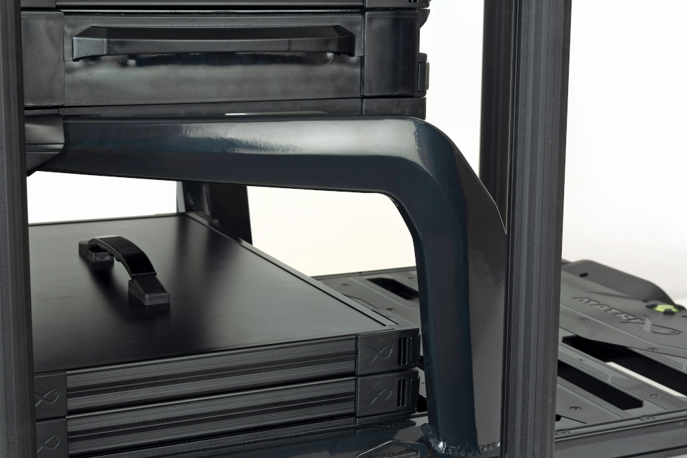 - Along with the main frame, this comes supplied with one shallow tray, a deep drawer unit and transport lid. The footplate, covered in textured non-slip plastic slides out with a single hand release. All the legs are fully anodised, and topped with handy screw threads for attachments. The height is fully adjustable, with easy to use large rubber screw-handles and a built in spirit level to take out the guesswork.