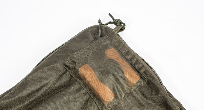 Regarded by many anglers as one of the safest retainers currently on the market, these retention systems are manufactured from a super soft highly breathable loose weave mesh and secured with a heavy anti snag locking zip. The included heavy duty rot proof retention cord and threaded bankstick attachment locate into their own Velcro pocket for transport. On the opposite end there’s another small pocket with a floating H-block to give you a rough idea where the fish is currently located when they’re sacked and lying low.Â