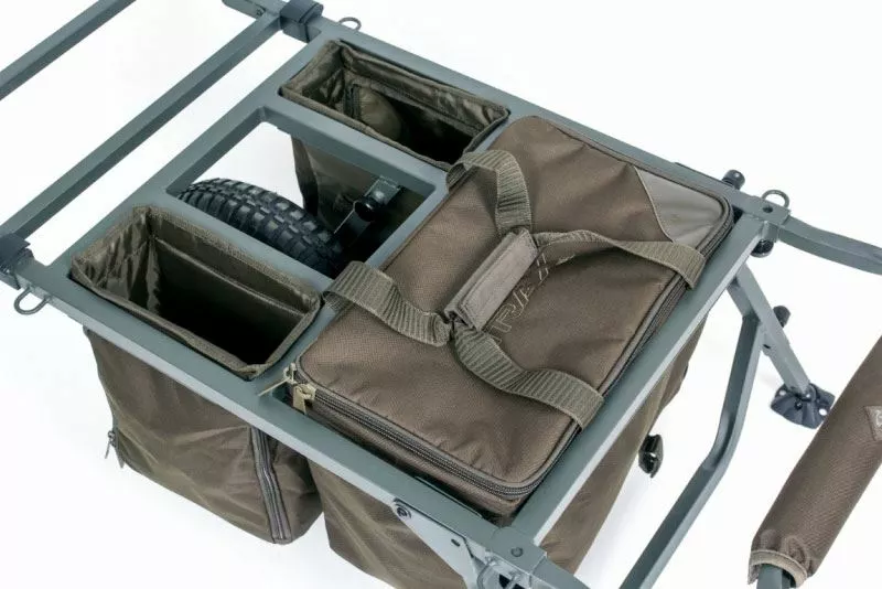 Great for getting your gear to the bank in record time! This features twin metal rimmed drop in side compartments which flank the wheels which are great for tackle, bait and accessories that also feature waterproof wipe clean sides. Offering smaller breakdown dimensions for transporting in cars but comfortably carrying a bed chair and session kit to keep you on the move easily. Making this the ideal choice for the mobile and short session carpers.