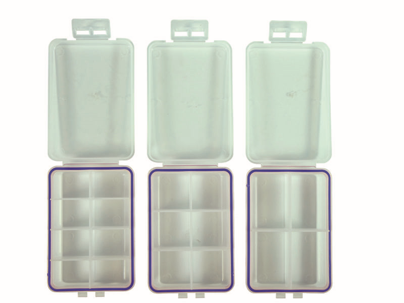 A set of three neat stackable containers with different sized dividers in each. Great for storing your spare hooks, swivels and beads. Each lid is held securely in place with locking clips at either end, and protected against the elements with a rubber seal running around the outer edges.