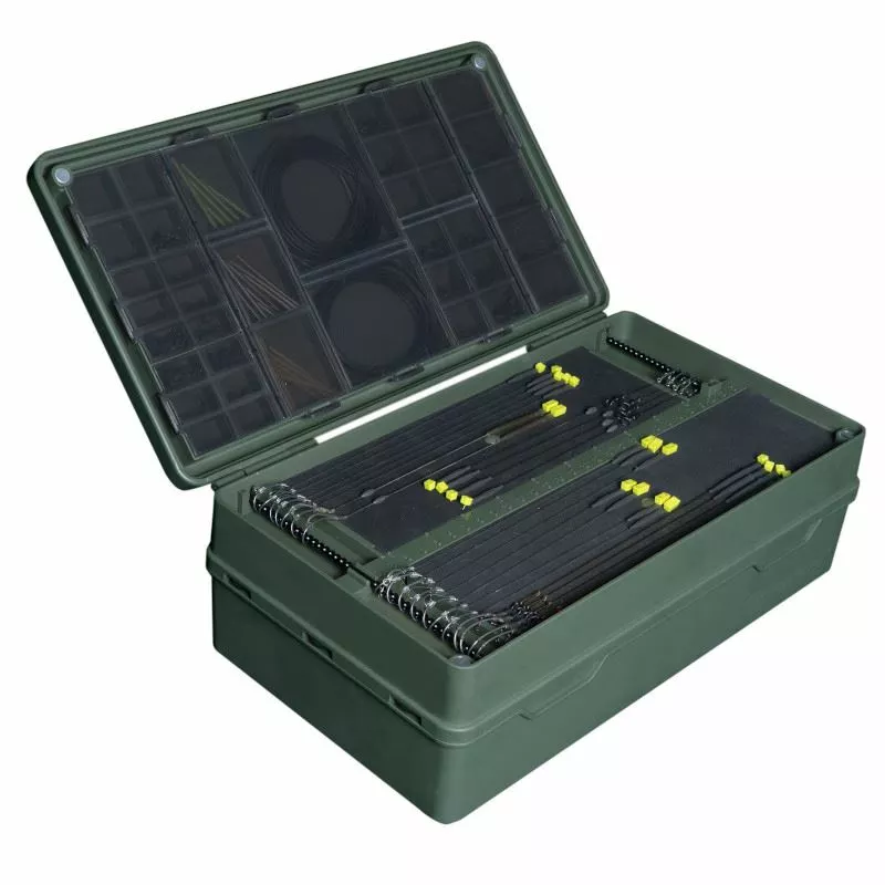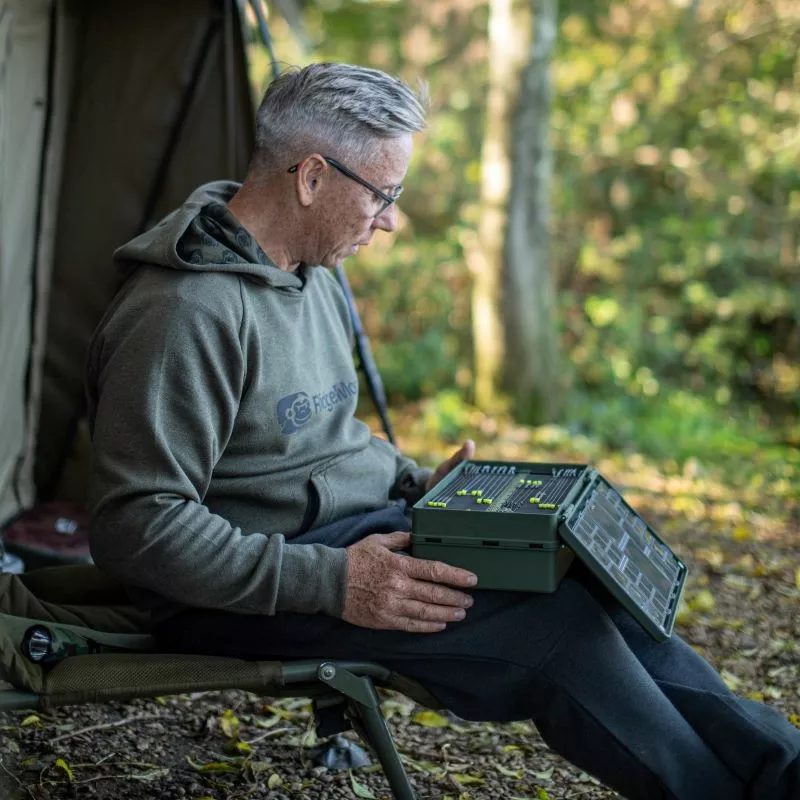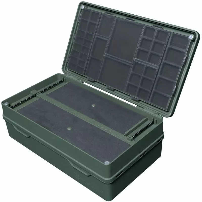 The Ridge Monkey armoury pro tackle box builds on the popularity of the existing armoury tackle box. Adding an updated lid that comes with an additional 38 storage compartments. Giving you an impressive 67 compartments of different shapes and sizes with storage for everything from rig tools and scissors, to swivels and hooks. There are also three rig boards included to safely store your hooklengths, with 45 single and 30 double rig pins included.Â