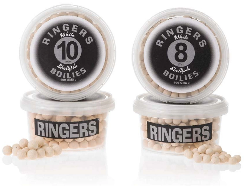 Ringers Boilies White Shellfish boilies, ideal for use as hookbaits when fishing the Method feeder and available white, yellow and red versions. The boilies are quite hard, and need to be hair-rigged using a baiting needle but they have a uniform consistency and there is no danger of them splitting.