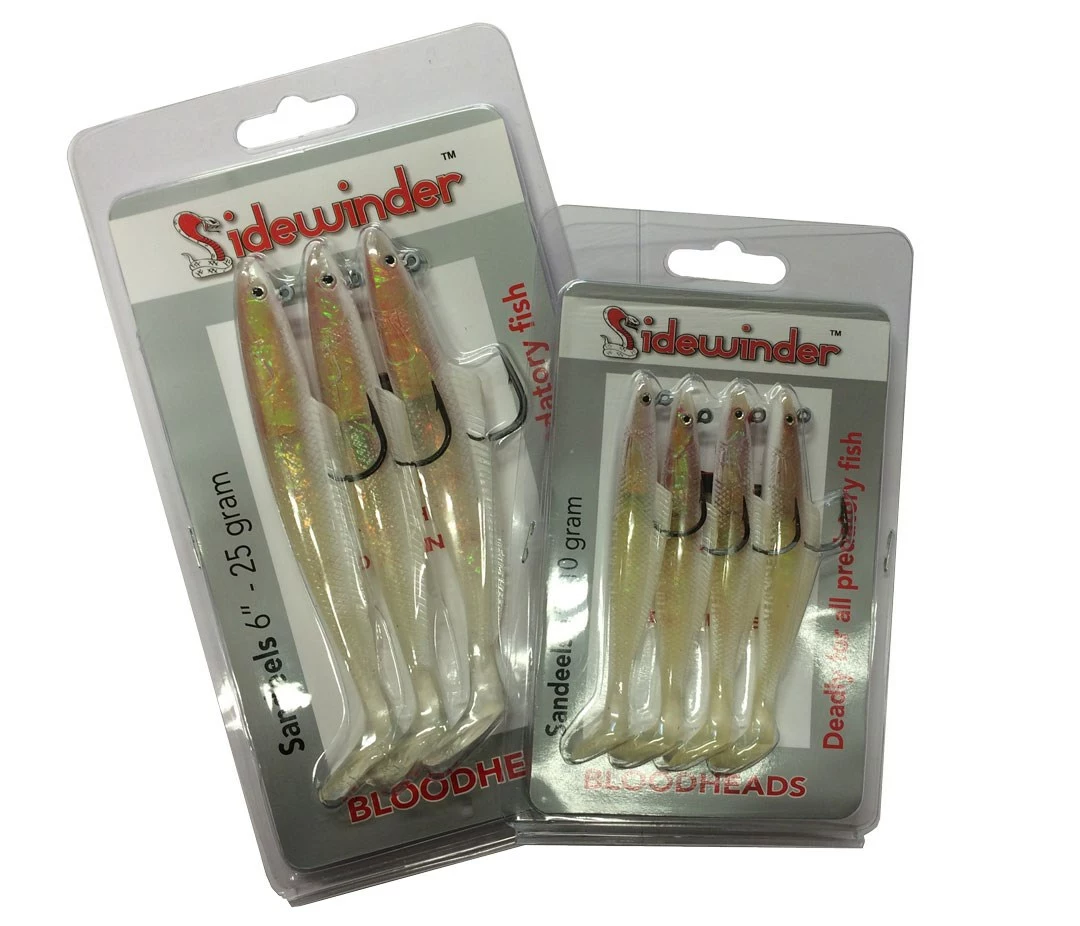 Sidewinder Bloodhead Sandeels, ultra realistic sandeels with built in holographic inserts and internal weights. Fitted with super strong Mustad 32786BLN hooks and carrying the same specifications as standard Sidewinder Sandeels. These enhanced versions also have blood red internal weights covered with reflective Super Holo foil. Designed to flash red/silver/red etc when worked back through the eater, giving the impression of a wounded baitfish.