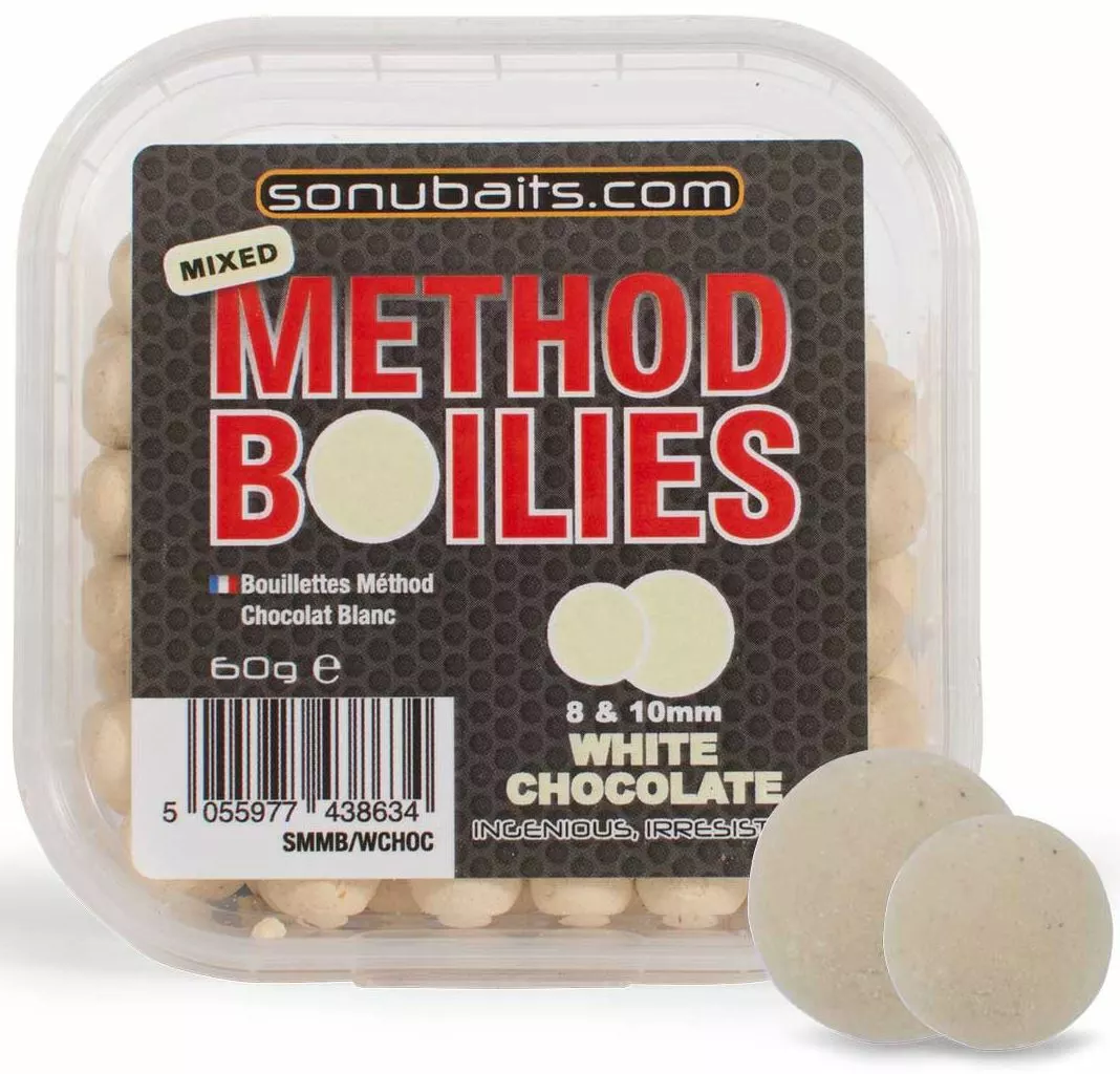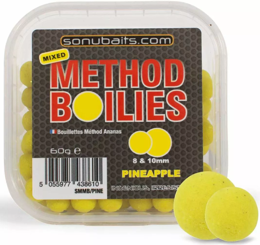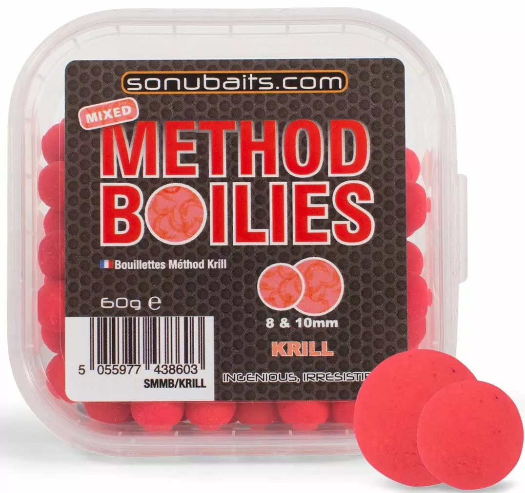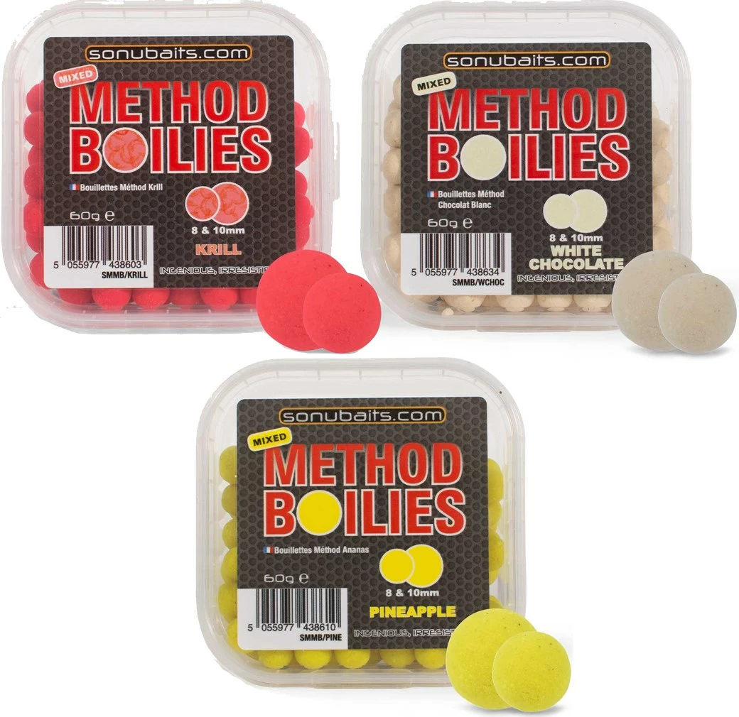 Sonubaits Mixed Method Boilies optimised hookbaits for method feeder work. Their durable structure makes them perfect for mounting on a hair rig or with a bayonet. Because of their durability they are also ideal for use with straight lead and bagging waggler techniques. Their strong bright colours make them the perfect hookbait which feeding fish pick out.