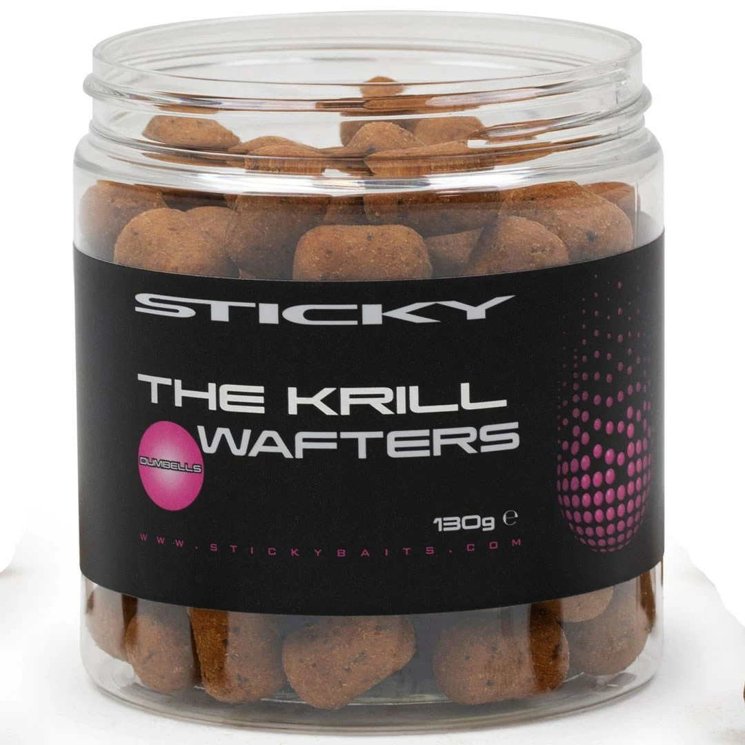 Sticky Baits The Krill Dumbell Wafters, based on the popular Krill boilie range, these 16mm critically balanced baits have just enough buoyancy to counteract the weight of your hook. Giving near perfect presentation. Use with the matching bait glug available to further boost attraction.