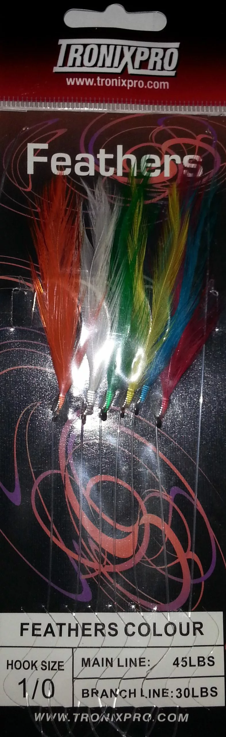 TronixPro coloured feather rigs, one of the most popular patterns used for mackerel  from boat or shore. Supplied with swivel and lead clip, straight out the pack and into the water, no messing about!