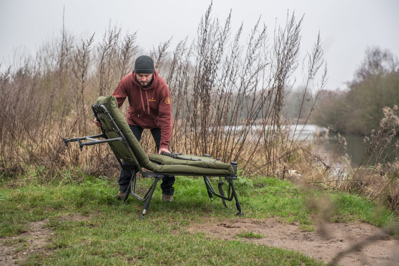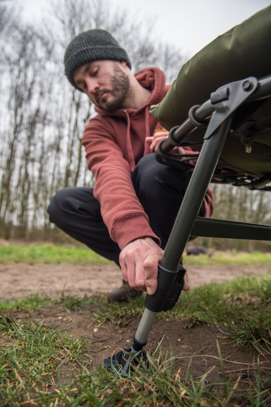 A Premium steel framed bedchair with six adjustable locking legs that allow you to get a level surface on uneven ground. The main mattress is fleece lined, and has a generous padded pillow and edge running around the outside of the support bars eliminating the frame poking you in the night. Topped off with well thought out extended hinges that allow you to collapse with a sleeping bag inside. Â